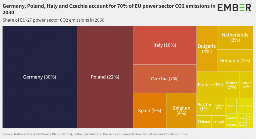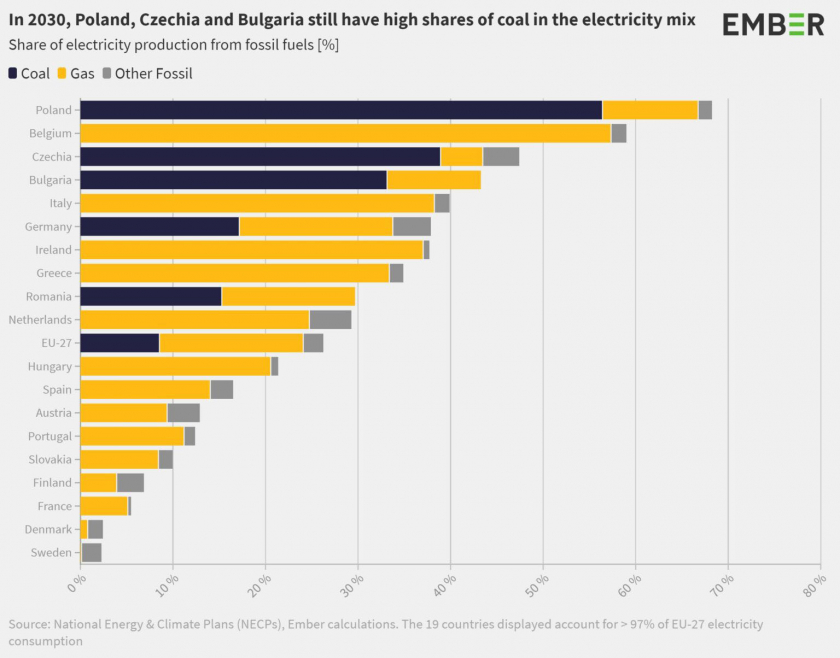Graf britského think-tanku EMBER ukazuje, jaký podíl bude mít uhelná energetika v členských státech EU za deset let. Nezmiňuje Estonsko, takže na třetím místě těsně za ČR se umísťuje Bulharsko. Zatímco země jako Belgie nebo Nizozemsko, které mají rovněž vysoký podíl uhlí, přestaví své elektrárny v té době již na plyn, střední a východní Evropa bude se stejným procesem teprve začínat.