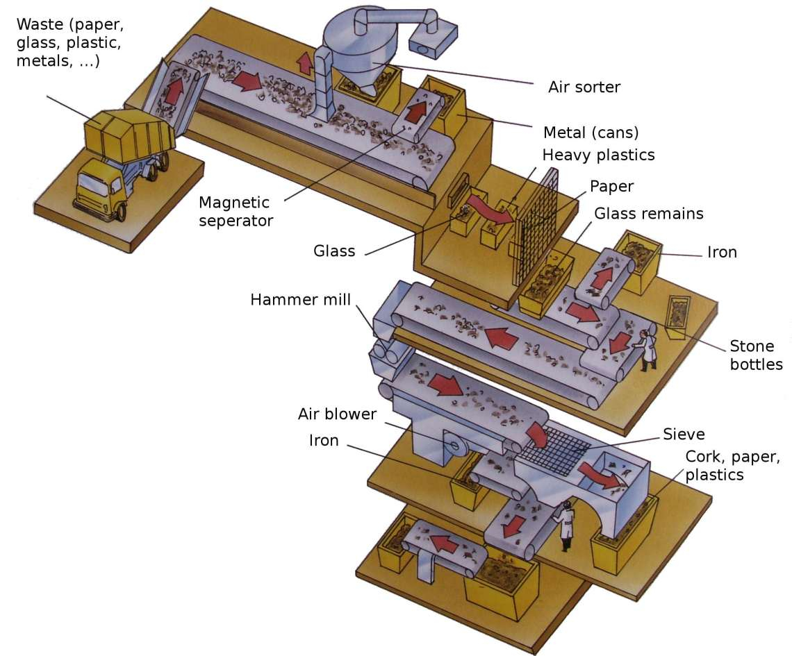 Separátory oddělují plechovky magnetickou cestou. Odpad je následně slisován do balíků a prodáván do továren. Uzavřenou smyčkou je také recyklace dalších kovů a skla (s výjimkou čelních skel automobilů a varných nádob, které obsahují příměsi). Sklo je drceno na malé střepy a prodáváno sklárnám, které jej roztaví a přimíchají do nového skla. Výroba skla je také energeticky náročná, takže jeho recyklace má pozitivní efekt na životní prostředí.